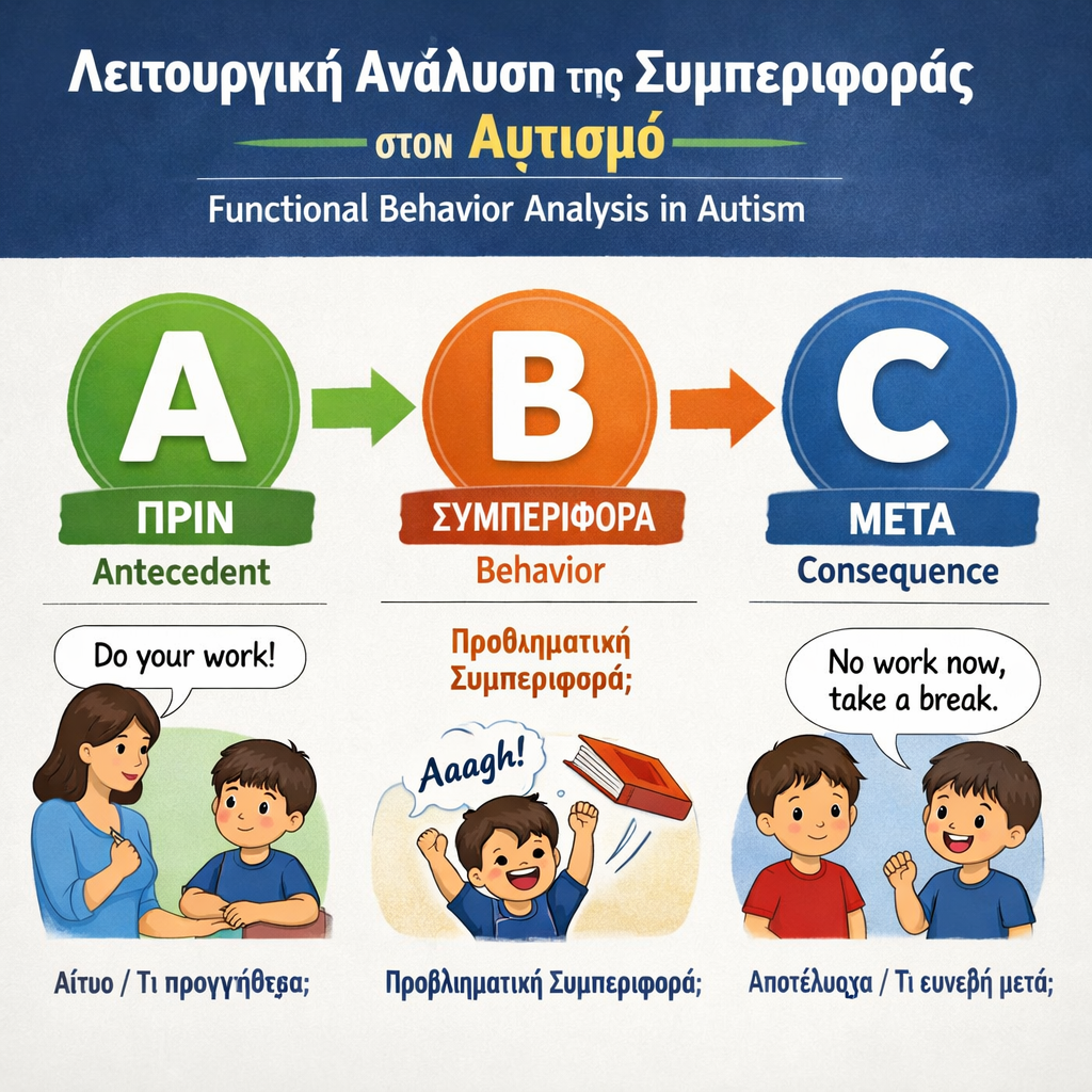 Η συμπεριφορά ενός παιδιού με αυτισμό συχνά παρερμηνεύεται ως δύσκολη ή ανεξήγητη. Στην πραγματικότητα, όμως, κάθε συμπεριφορά έχει έναν λόγο ύπαρξης. Η Λειτουργική Ανάλυση της Συμπεριφοράς ( FBA = Fuctional Behavioral Assessment) έρχεται να απαντήσει στο κρίσιμο ερώτημα «γιατί», βοηθώντας μας να κατανοήσουμε τι προσπαθεί να εκφράσει το παιδί μέσα από τις αντιδράσεις του.